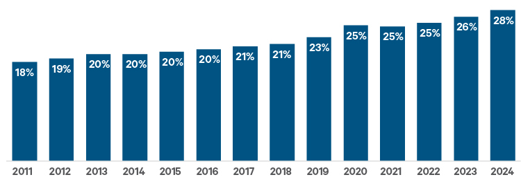 In 2025, female clients accounted for just over 20% of Davy’s funds under management with joint relationships making up an additional 24%. Splitting joint accounts equally (based on an even mix of genders across all accounts taken together), the female share of the wealth on which Davy advises has been rising steadily (see Figure 5).
