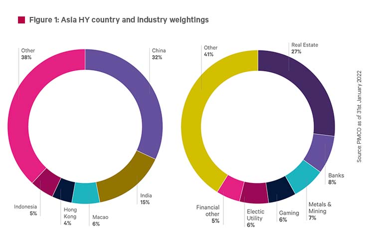 From a geographical perspective, we see in Figure 1 (based of PIMCO’s GIS Asia High Yield Bond Fund) that Asia HY is dominated by Chinese corporate issuers, who make up almost one third of the geographic exposure, while India is the second largest region (15%). At the industry level, real estate is the largest sector, at close to 27%, followed by banks (8%) and metals and mining companies (7%). Overall, Asia HY investors are getting roughly 21% exposure to Chinese real estate.