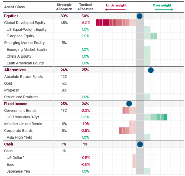 *Note that each box represents 0.5% of the overall portfolio. The blue circle indicates the tactical under-over-weight at the overall asset class level. * The tactical equity allocation means that there is a further 3% underweight to US dollars.