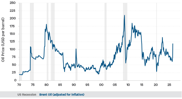 Figure 2: The price of oil and US recessions (1970-2026)
