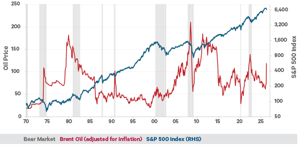 Source: DataStream, Standard & Poors. Oil price is adjusted for US CPI (consumer price index).